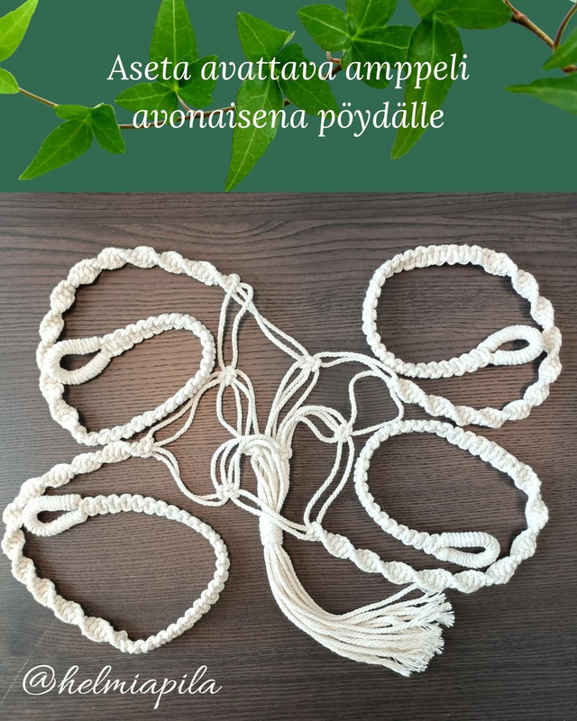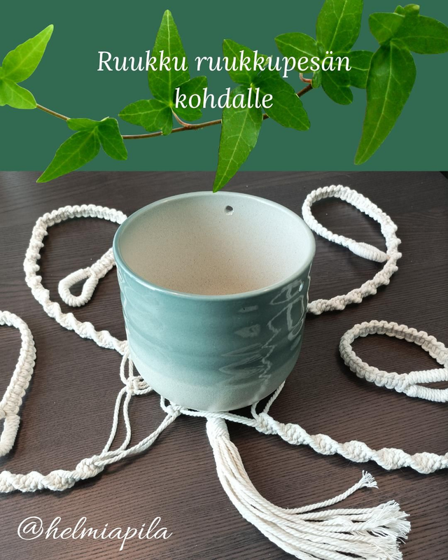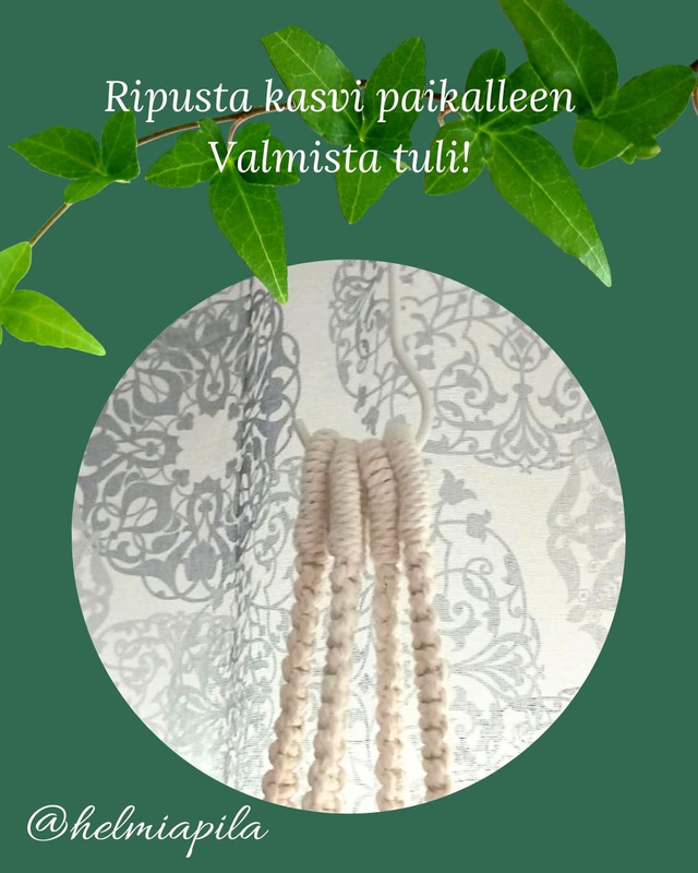 Pituus 65cm ripustuslenkkien yläreunasta ruukun alle tulevaan solmuun.