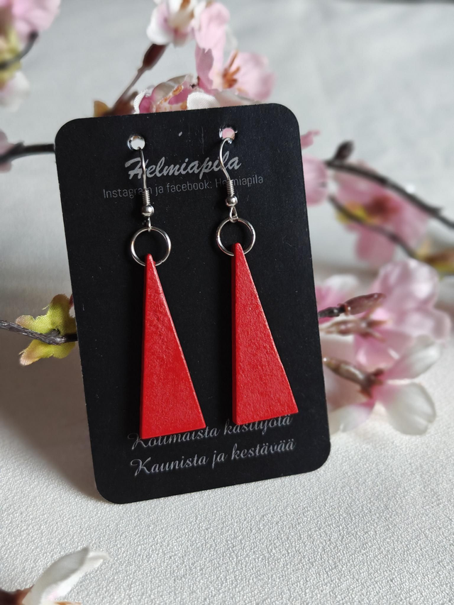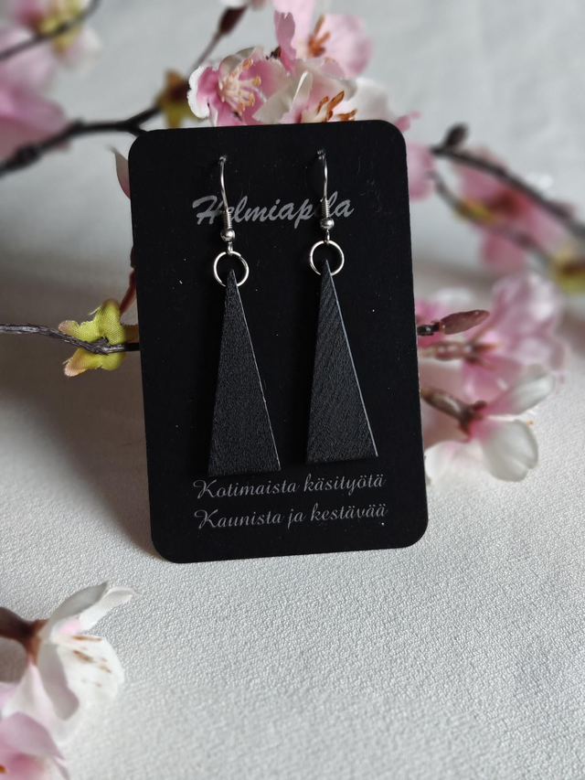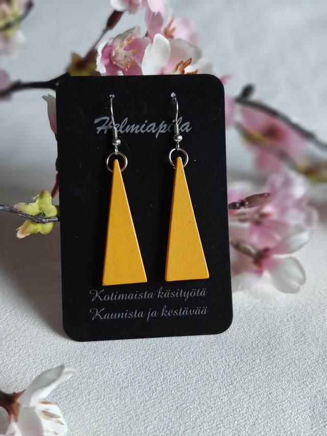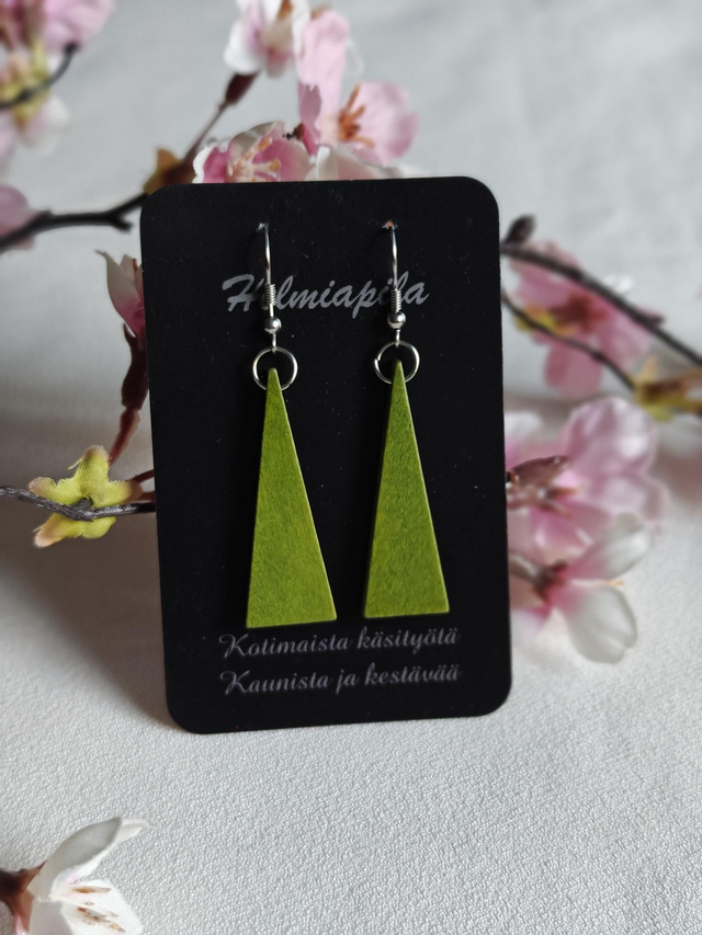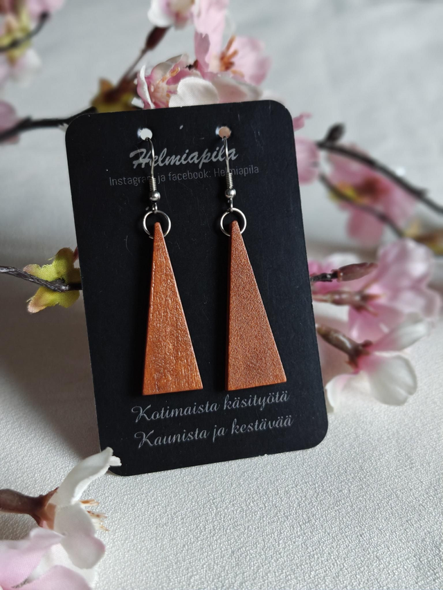 Kauniit ja kevyet korvakorut, sopivat arkeen ja juhlaan. Siro ja linjakas puuriipus, puun syyt ja luonnollisuus näkyy jonkin verran. Korvakorujen kokonaispituus 6cm. Nikkelittömät korvakorukoukut. Materiaalina ruostumaton, kirurgin teräs. Silikonistopparit. Minta väriä, vaikka joka asuun. Uusi edullisempi hinta!